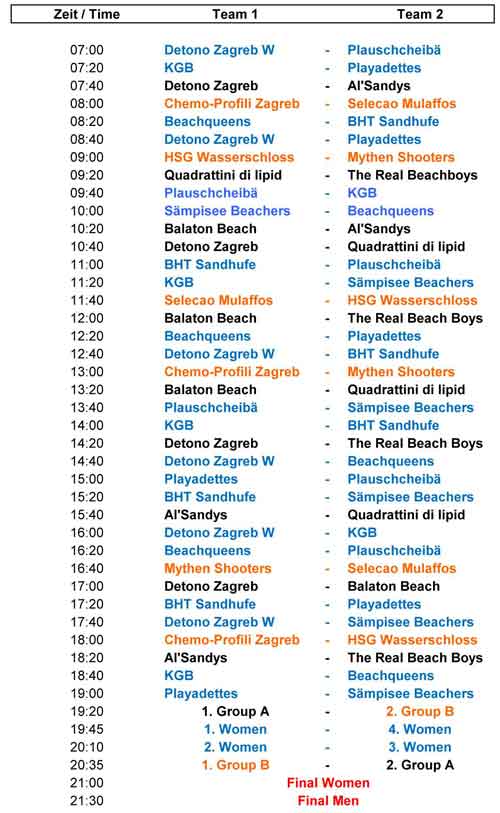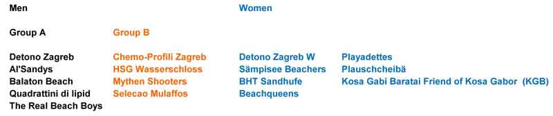 U muškoj konkurenciji nastupiti će ekipe domaćina (Selecao Mulaffos, Mythen Shooters, HSG Wasserschloss, The Real Beach Boys, Balaton Beach, Quadrattini di lipid), ekipa iz Njemačkog Herrenberga Al Sandys, ekipe iz Hrvatske (Detono Zagreb, Chemo-Profili Zagreb). U ženskoj konkurenciji nastupiti će ekipa iz Mađarske, ekipa iz Hrvatske (Detono Zagreb) te Švicarske ekipe (Beachqueens, Plauschcheibä, BHT Sandhufe, Sämpisee Beachers, Playadettes). Neke od nabrojanih ekipa zasigurno su poznate pjeskašima.